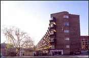 Den 280 meter lange boligstok vender ryggen mod Tomsgårdsvej, mens 210 små altaner blomstrer ud på sydøstsiden. Den lette drejning af nordøstgavlen bryder ethver ansats til det stereotype.