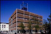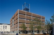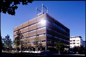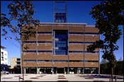 Kontorhuset fremstår som en glasbygning med stålrammer der er solafskærmet med udvendige jalousier af strengpresset tegl.
