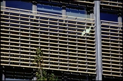 Nærbillede af de strengpressede teglpaneler ophængt i et stålstativ uden på glasfacaden. Teglbåndene er ophængt med en hældning på 20 grader.