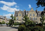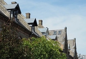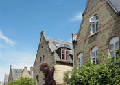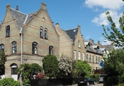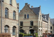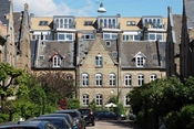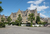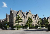 mursten. Længehusene er mod tagfod afsluttet med enkle gesimser. Frontkvisthusenes og hjørnehusenes gavle er afsluttet med skarp kant mod skifertagbelægningen. Vinduerne er dannebrogsvinduer placeret ligesom facadedørene i