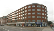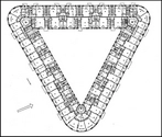 Den trekantede grund er bebygget med et seksetagers boligejendom, hvor de tre bygningshjørner udadtil fremstår som afrundede cylinderformer bag hvilke husets hovedtrapper gemmer sig.