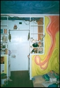 Entre i mindre lejlighed med hippieagtig vægbemaling.