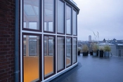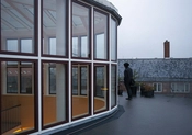 Fra trapperummene er der adgang til en bred tagterrasse med udsigt over byen.