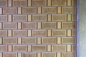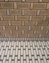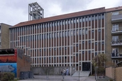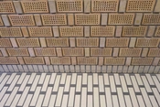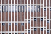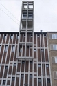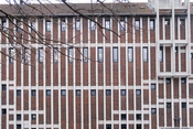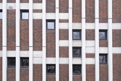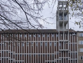 De vertikale betonpilastre indrammer murede moduler i rød sækkeskuret mursten. Pilastrene giver facaden dybde samtidig med at de vertikale elementer forbinder til kirkens tårn. Tårnet har et strukturelt konstruktivt udtryk.