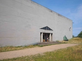 Facaden fremstår i plan betonforskalling med hovedindgangen indbygget som et symbolsk tempelrelief. Gennem den trange dør, der har en højde på kun 180 centimeter, anes centralrummet.