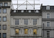 Udsmykningen er præget af markeret, sokkelpræget underfacade (bossage-, refend-, kvader- og diamantkvaderpuds) og friser og bånd ved vinduer og port.