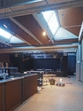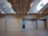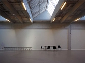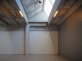 Multisalen “Mellemrummet” er et rent afskallet industrirum. Her er alle overflader renset ned til beton og hvide tegl, mens gulvet er støbt i blank overfladebehandlet beton.