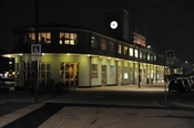 Set fra nordvest ved aften med facaden oplyst af baldakinens lamper.