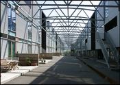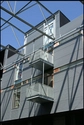 Elevatortårn med gangbroerne, der forbinder etagerne internt.