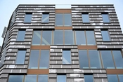 TRÆ er – udover træ – bygget i beton og glas, og mange af materialerne er genbrugte eller upcyclede – som for eksempel kasserede vindmøllevinger, der er brugt på facaden. Derudover er der genbrugt facadeplader, mursten, træ, termoruder og andre materialer.