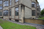 Karanpperne er trapezformede med vinduesbåen i hele bredden og mellem karnapperne er der etableret indgangspartier omkranset af indfatninger i granit.