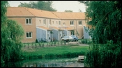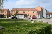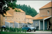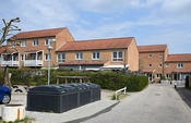 Lyseblå udbygninger af træ bryder bebyggelsens dominante anvendelse af tegl.