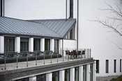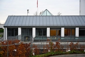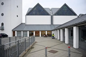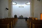 Indvendigt fremstår kirkerummet lyst og moderne med høje lofter og karakteristisk oplyst af de syv store glasmosaikker af Peter Brandes.
