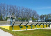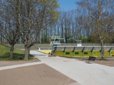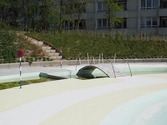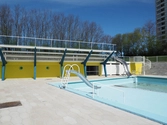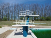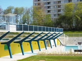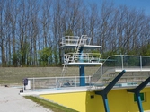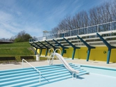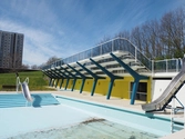 Friluftsanlægget består af to bassiner. Et højtliggende 25 m bassin med vipper og tilskuerpladser på langsiderne og et lavere liggende, mindre børnebassin med tilknyttede opholdsarealer. Langs Nykær liger kioskbygningen; en lang, smal træbygning, som dengang var hovedindgang til friluftsbadet og desuden indeholdt kiosk, billet- og personalekontor. I det sydøstlige hjørne ligger en stor spiralformet vand- og trafiklegeplads med en vandskulptur i midten udformet som en hane.