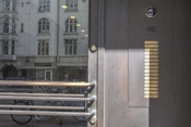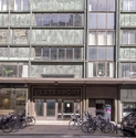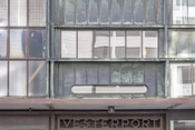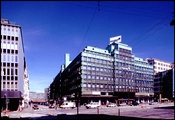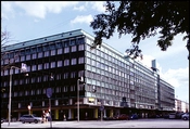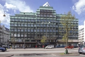 Vesterports nordvestlige hjørne mod Gl.Kongevej fremstår stram og en anelse tør. Bemærk de hvide søjler på husets nedre etager der brydes af en gennemgående baldakin.