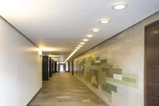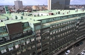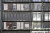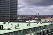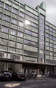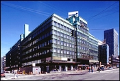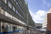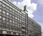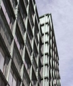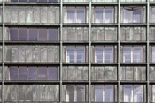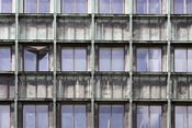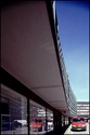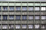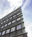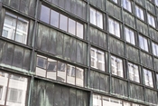 Fra bygningens sydvestlige hjørne står kontorhuset stramt retvinklet med gennemgående vinduesbånd.