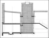 Den store, langsgående mur er underdelt i nicher, der på bagsiden - i udstillingsgangen - udnyttes til museumsmontre.