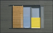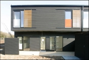 Husenes facader er overalt beklædt med sortmalet træ, men skydeskodder foran vinduer og terressedøre har en lys brun farve.