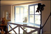 Interiør med udsigt gennem dekorativt rækværk og oplukkelige sprossevinduer.
