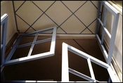 De mindre opsprossede vinduer og det diagonalt mønstrede loft er sammen med pastelfarver karakteristiske for den postmodernisme der florerede under husets opførelse.