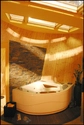 Indtryk fra indretningen af Bountyland, et ellipseformet vådrum udstyret med pejs, palmer, liggestole, spabad og kombineret bruse- og solbad-element.