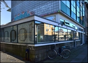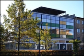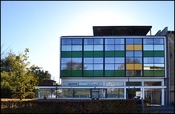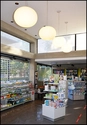 Det er et hvidt beton-, stål- og glashus i tre etager med et apotek i stueetagen og forskellige klinikker og kontorer øverst.
