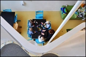 Udvendig trappe, som børnene kan kravle på og skærme , fører op til tag med højt elefantgræs de kan gemme sig i.