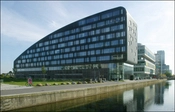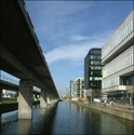 Bygningen har facade ud mod Ørestadens kanal og Metroen og er samtidigt nabo til Gymnasiet, der ses i forgrunden til højre.