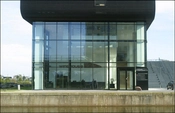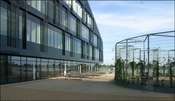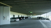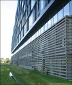 Parkeringsanlægget befinder sig bag nordfacadens lamelbeklædte facade.