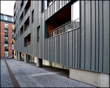 Forpatineret zinkplader med stående false er anvendt overalt på facaderne, selv tagbeklædningen.