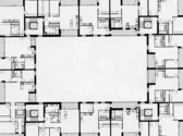 Facaden er løftet op i den side der vender ud mod pladsen. en effektfuld virkning i forhold til det tunge udtryk i øvrigt.