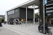 Indgangspartiet til Zoologisk Have blev vundet i en arkitektkonkurrence 1996 af Christian Cold. Bygningen stod færdig 1998 - her set fra Roskildevej. Den nye indgangsportal står som en hvid ramme omkring en mørkegrå butiksklump og et træskrin i to etager, der indeholder billettering og opgang til biograf og foredragssal.