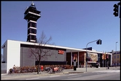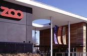 Indgangspartiet til Zoologisk Have blev vundet i en arkitektkonkurrence 1996 af Christian Cold. Bygningen stod færdig 1998 - her set fra Roskildevej. Den nye indgangsportal står som en hvid ramme omkring en mørkegrå butiksklump og et træskrin i to etager, der indeholder billettering og opgang til biograf og foredragssal.